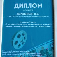Деревянкин Н. Е. занял II место в 3 категории Областного дистанционного конкурса семейных видеороликов «Моя семья — Моя Победа»