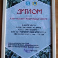 Команда техникума награждена Дипломом за III место в областном конкурсе агитбригад «Солдат войны не выбирает» Областного месячника героико-патриотической и оборонно-массовой работы в 2020 году.