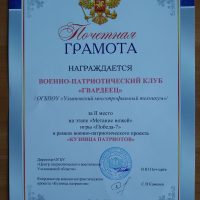 09.12.2020 в рамках III слёта патриотического воспитания «#ULPROFPATRIOT» Военно-патриотический клуб «Гвардеец» ОГБПОУ «Ульяновский многопрофильный техникум» занял I место на этапе «Снаряжение магазина» и II место на этапе «Метание ножей» игры «Победа-7» в рамках военно-патриотического проекта «Кузница патриотов».