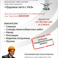 ООО «УАЗ» предлагает принять участие в проекте «ТРУДОВОЕ ЛЕТО С УАЗ»